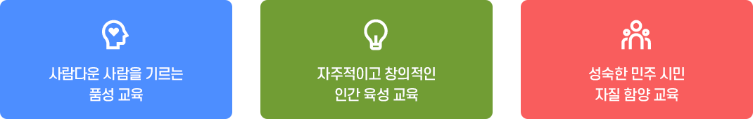 - 교육을 통해 아동들이 다양한 지식과 정보를 습득하고 도덕성과 정서를 함양하며 서로 사랑하고 협력하는 태도를 익힘으로써 균형 잡힌 인격체로 성장.