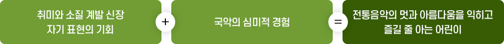 국악의 심미적 경험을 통한 협동심 및 바람직한 인격 형성, 가치관 형성에 도움을 줍니다.